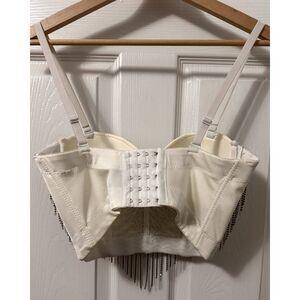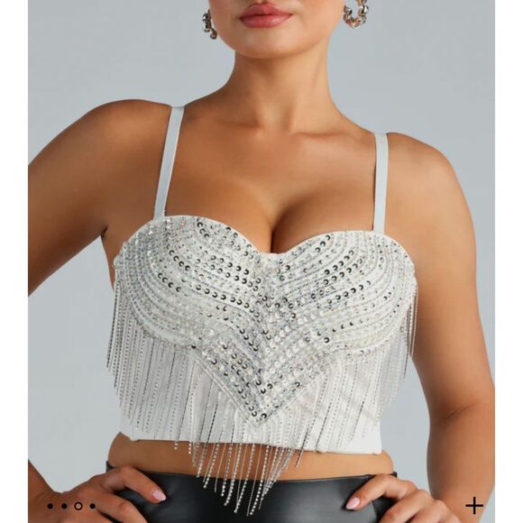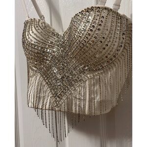 WINDSOR "I'M THE CATCH" WOMEN'S SEQUIN RHINESTONE FRINGE WHITE BUSTIER Sz SMALL
