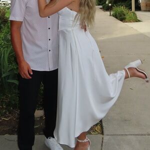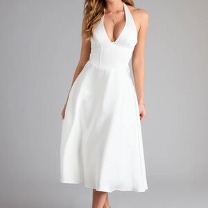This elegant white halter dress is perfect for any occasion. Its sleek design and flattering fit make it a must-have in your wardrobe. She's giving hopeless romantic but still knows how to steal the spotlight. With a dreamy plunge neckline and lace-up back, this corset satin midi dress was made for picture-perfect moments as the bride-to-be, birthday girl, or guest!