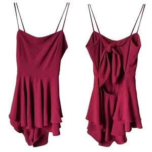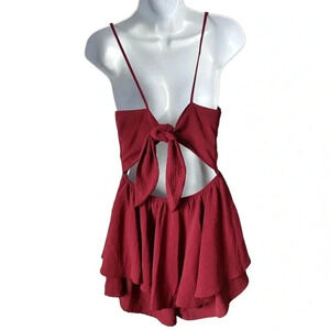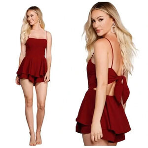 Seal your cute look with a romper that brings the flare! The romper features a sleeveless square neckline. spaghetti straps. tie-back straps that can create a bow. and a lower back keyhole cutout. The slim-fit bodice leads to a pair of wide-leg shorts with a skater skirt overlay.