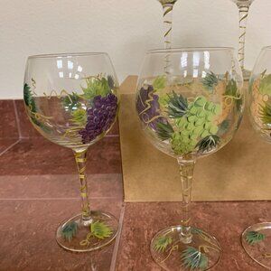 This listing is for 6 hand painted wine glasses with a vineyard painted theme that shows beautiful red grapes, bright green leaves and gold vines, in excellent condition. These are new but have been stored in the cabinet. Comes from a smoke-free home but I do have a dog and a cat (noted for those that might have allergies).