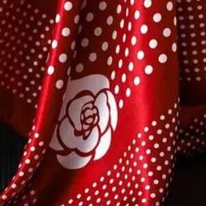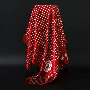 New in original packaging. Measures approximately 36" square. Really nicely patterned with large & small polka dots separated by solid red along with some lovely white roses to highlight. Gorgeous wine red.