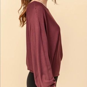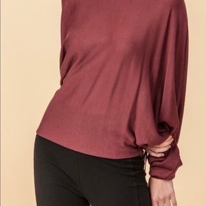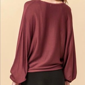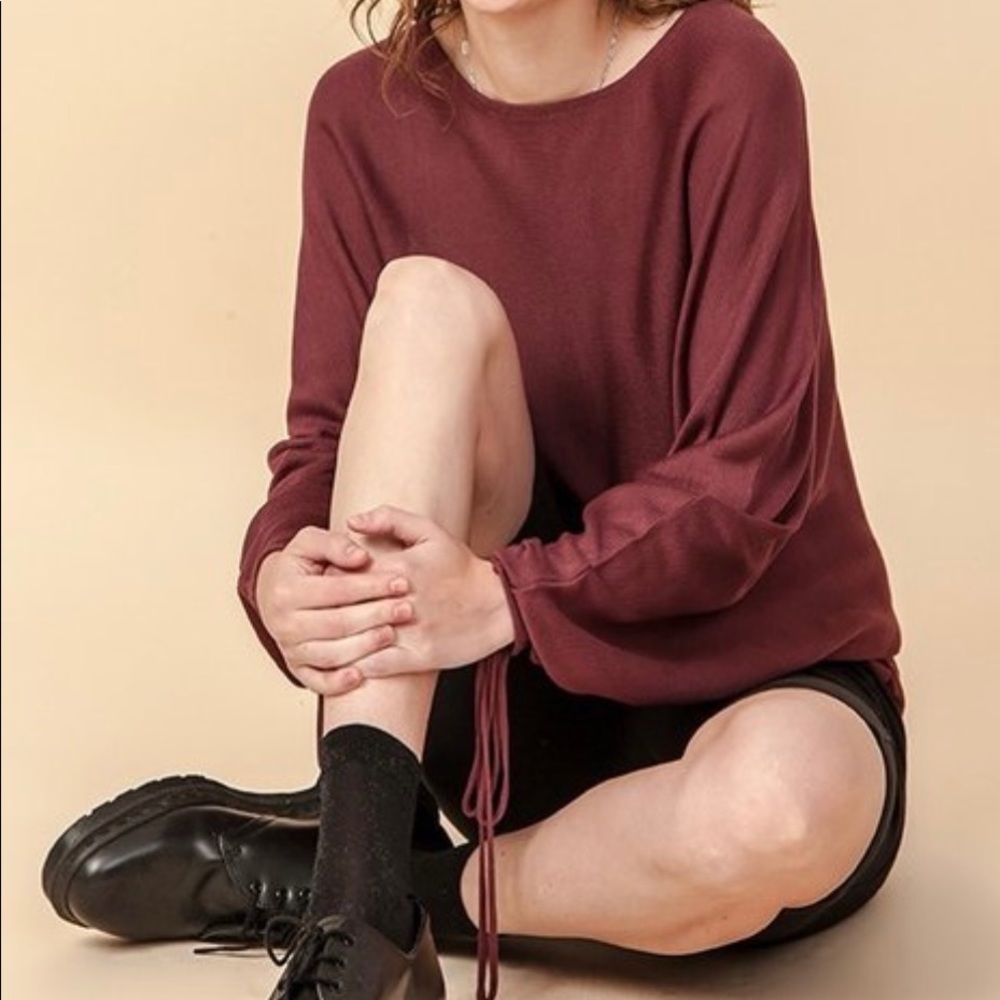 Cute and comfy sweater top in red brown. It’s batwing arms and drawstring sleeves make this sweater adorable and very unique! The color is just absolutely beautiful!