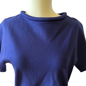 Womens size 12, navy blue, back zipper, short sleeves, rolled collar, ruched waist.