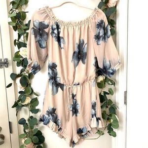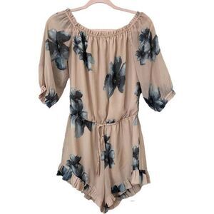 Tan romper with blue floral design. Off the shoulder with elastic neckline. Elastic waistband with adjustable drawstring. Slouchy fit - runs big. Lined. 100% polyester. Great preowned condition - no flaws. Size Small