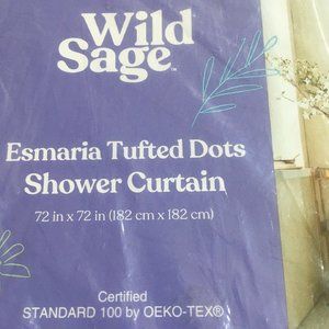 brand new Wild Sage Esmaria 72 x 72-inch 100% Cotton Shower Curtain ... Light Gray 100% Cotton Background with Round Tufted Dots in Medium/Dark Gray and White colors. Lightweight cotton with buttonholes on the header hem to accomodate shower curtain hooks which are sold separately. Machine washable. Condition is brand new in unopened, undamaged retail packaging ... UPC 0444800469122.