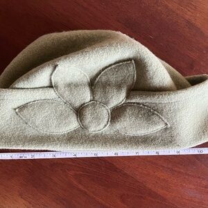 100% wool hat with large flower sewn in. Warm! Made in Canada.