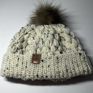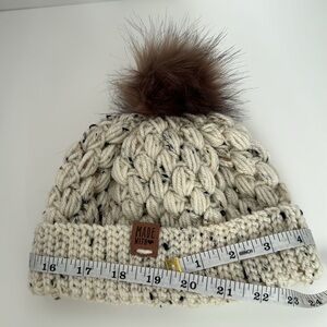 #1 This is a handmade crocheted hat. Cream color with specs of brown tan and black. Tannish pom Pom on top. Leather tag that says made with ❤️. It is 19 1/2 inches in circumference. It is brand new and made in a smoke free environment.
