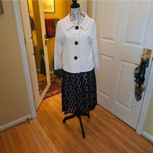 Just back from the cleaners!This jacket is the epitome of versatile! Wear over a dress or create a "suit look" paired w/ a skirt or pants. It is 55% polyester, 30% rayon & 5% spandex. Size 10. Worn once. It features a soft pleated back & tortoise like buttons. EUC.