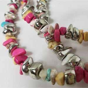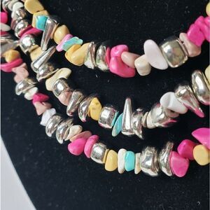 3 strands of brightly colored tumbled and polished stone chips along with resin beads.