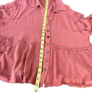 WISHLIST APPAREL WOMEN’S SIZE L, DUSTY, CORAL BUTTON-DOWN BLOUSE. Has ruffle at the waist and button wrist. The back is longer than the front by 3 inches. This top is oversized and boxy. Made of 100% rayon. Really cute.