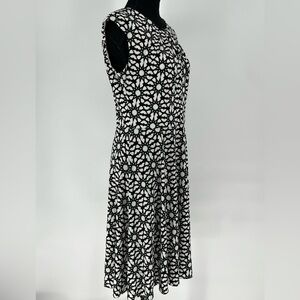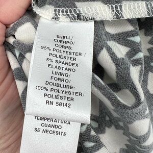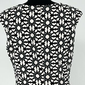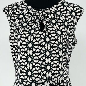 WISP GEOMETRIC KEYHOLE BODICE WHITE DRESS BLACK DESIGN WITH BLUE ACCENT.