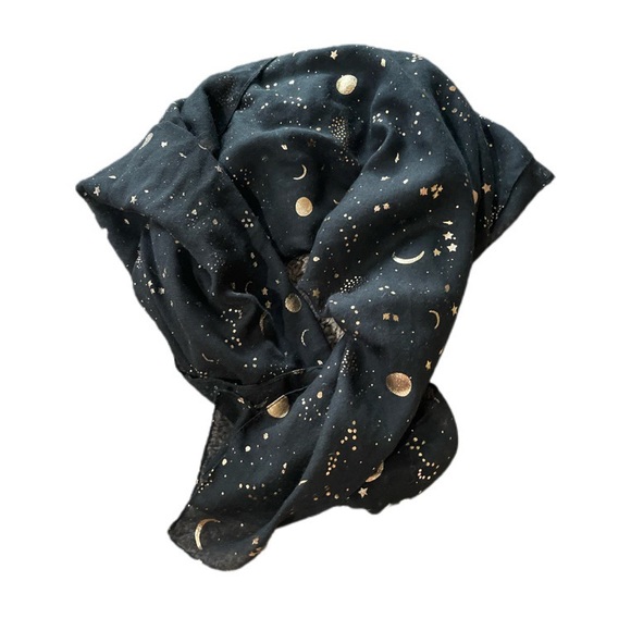 Ahhhh I love this scarf! It features a soft and breezy black fabric with metallic gold celestial print all over. This is perfect for any season, the breezy fabric makes it a great shaw or diy top in the summer, or you can wrap it around and layer it to keep you warm in the winter! If you have any questions let me know and don’t be afraid to make an offer! 💖✨