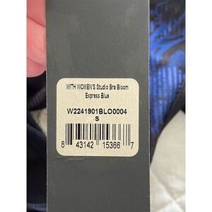 The WITH sports bra in size Small is designed for women and comes in a blue floral pattern. Made from a blend of polyester, spandex, and foam, it features a mesh fabric type. This wireless bra offers full cup coverage and is suitable for activities like yoga and gym workouts. It has a strappy design with a pullover closure. Manufactured in El Salvador, it is machine washable and ideal for activewear occasions. The item is new with tags.