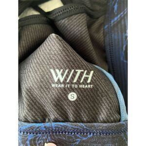 The WITH sports bra in size Small is designed for women and comes in a blue floral pattern. Made from a blend of polyester, spandex, and foam, it features a mesh fabric type. This wireless bra offers full cup coverage and is suitable for activities like yoga and gym workouts. It has a strappy design with a pullover closure. Manufactured in El Salvador, it is machine washable and ideal for activewear occasions. The item is new with tags.