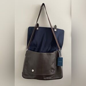 Cole Haan Leather Messenger Bag in brown, two buckles and an adjustable strap. Deep blue interior with sleeves. NEW WITH TAGS.