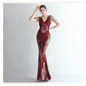 Wine Red,Sleeveless, Round Back, V Neck, Beaded Draped Sleeves, Contrast Sequined Mermaid Maxi Gown for Special Events