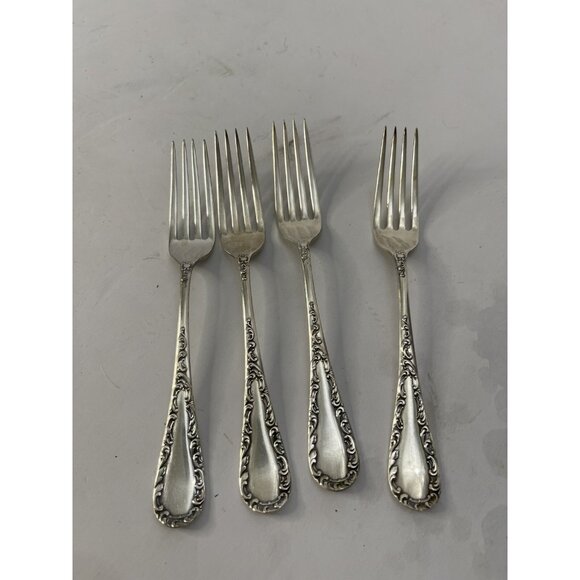 This set of four dinner forks by Wm. Rogers & Son is a vintage treasure for any collector of antique silver plated flatware. The forks are made of silverplate and are in excellent shape, ready to be displayed or used for special occasions. The intricate design and craftsmanship of this set dates back to 1900-1940, making it a unique addition to any collection. The set features the iconic WM Rogers & Son brand and is a perfect example of the high-quality silverware produced during this time period.