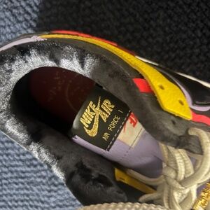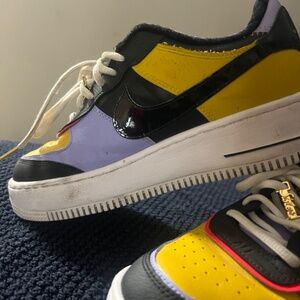 A mix of yellow, black, purple,and red accents. The shoes have a layered look,with double swooshes, mudguards, back tabs ,and eye stacks .The laces are white and have metallic gold lace jewels that spell out the word “Sister” once wore