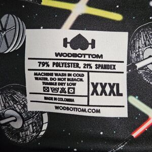 Fun and bold Star Wars-themed workout shorts by WodBottom, perfect for fans of fitness and the Force. These soft, high-stretch shorts feature a colorful lightsaber and Death Star print on a deep space background. Designed for movement and comfort.