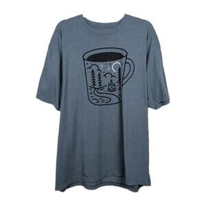 Heather blue short sleeve crew neck t-shirt with coffee mug and camping scene screen-printed graphic by Wohven. This design is from their March 2019 release.