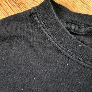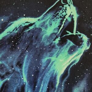 THE GRAPHIC FEATURES 3 WOLVES. THE SKYLINE FEATURES AN IMAFE OF A WOLF IN THE NORTHERN LIGTHS. THE BRAND IS DOM AND IS A SIZE MEDIUM. THE BLACK IS FADED, AND THE GRAPHIC DOES HAVE SOME CRACKING. THERE ARE TWO HOLES ALONG THE HEM OF THE NECK. THIS CAN BE SEEN IN THE PHOTOS ABOVE.