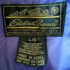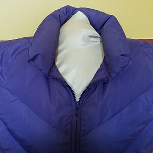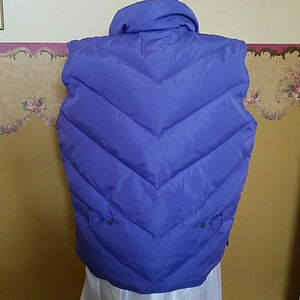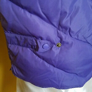 Woman's Eddie Bauer purple puffer goosebown vest (sz lg). The vest has a zjpper closure. There are front pockets. On the back near rhe waistline there are 2 snaps to ensure a good fit.