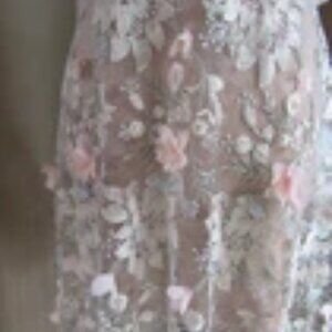 FLATTERING , Fluttery appliqués create a lovely 3D effect on a sleeveless A-line gown featuring a plunging décolleté neckline and a sweeping peekaboo skirt.