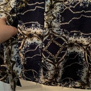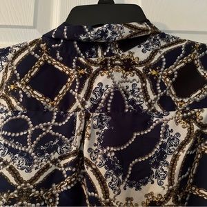 Add a pop of color to your wardrobe with this beautiful Tahari sleeveless top. The multicolor satin fabric with a silk pattern, accented with buttons and pearls, adds a touch of elegance to your party or cocktail attire. The blouse features a round neckline and a button closure, making it easy to wear. It is lightweight, packable, and breathable, making it perfect for all seasons. The vintage-inspired design with a modern twist is perfect for women of all ages. This blouse is available in size L and is a regular fit.