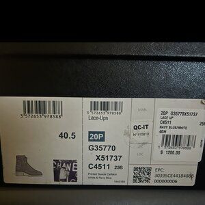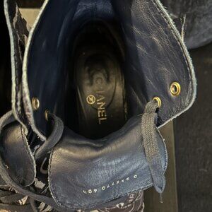 WOMEN 100% BEAUTIFUL WHITE AND NAVY BLUE LACE-UPS CHANEL SUEDE CALFSKIN LOGO BOOTS. ITS A SIZE WOMEN 40.5 WHICH IS A 10 1/2 BOOT. IT IS IN GOOD CONDITION, WITH A VERY LIGHT FADING ON DA SIDE OF BOOTS. THE HEEL AND BOTTOM OF BOOTS ARE MADE OUT OF A VERY DURABLE HARD RUBBER. THE BOOTS  ARE A TALK ABOUT AND STATEMENT PIECE TRUST ME YOU WONT BE DISAPPOINTED.