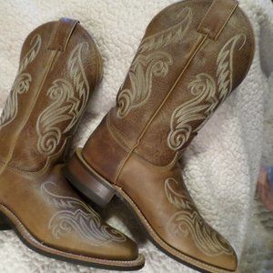 GORGEOUS, WELL CRAFTED, TOP QUALITY "JUSTIN" LEATHER WESTERN COWGIRL BOOTS!! SUPER NICE!! EXCEPTIONALLY GOOD PRE-OWNED CONDITION, SHOWING MINIMUM PRE-OWNED WEAR, FEW LITE SCUFF MARKS, THIN WEAR SOLES & HEELS, MED BROWN COLOR, SIZE 6.5 B. LENGTH- 10 1/2 in. HEIGHT-12 in. WIDTH- 3 3/4 in. FOR A VERY REASONABLE PRICE!!! THANKS FOR YOUR INTEREST!!!
