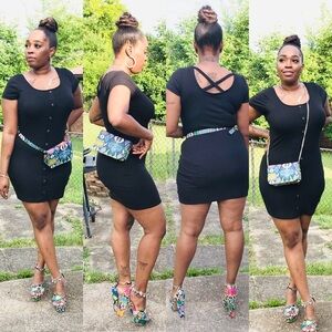 WOMEN SHORT SLEEVE BLACK SCOOP NECK CROSS BACK RIBBED KNIT BODYCON MIDI DRESS