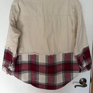 "SO" CREAM WITH RED/BLUE/GRAY FLANNEL BOTTOM COLLARED JEAN JACKET. 30"L