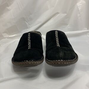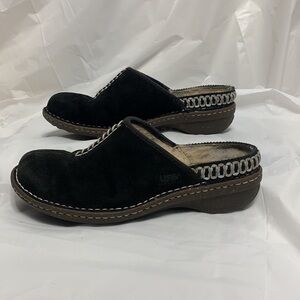 Women Ugg Black Suede Slip on lined Mules Stuke 5177 Size 8. Slight wear and tear to shoe and lining in heal area is missing. See photos.