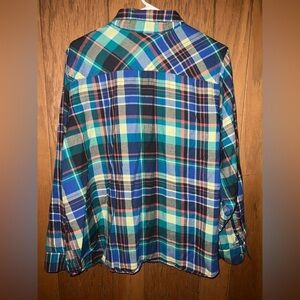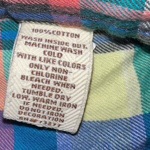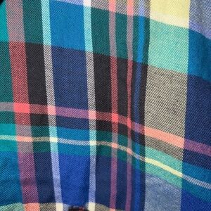 This is a Brightly colored small patterned plaid top. It’s nice and cozy with plenty of wear left for your cool/cold weather adventures or sitting fireside.