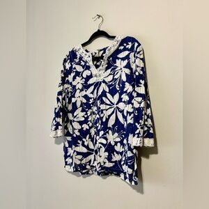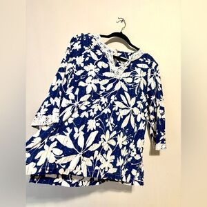 WOMENS ALFRED DUNNER BLUE WHITE FLORAL TRAVEL TOP SIZE 16