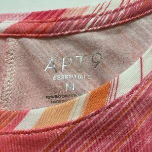Women's Apt. 9 sleeveless top. Size medium, 95% Rayon/5% Spandex. Colors of top include peach/pink/orange/creme. Nice shape!