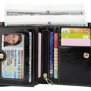 BRAND NEW WITH TAGS. 3 ID/FAMILY PHOTO WINDOWS.13 CREDIT CARD SLOTS WITH RFID BLOCKING. 25 BILL CASH POCKET. ZIPPERED COIN POCKET. SMALL ENOUGH FOR YOUR COAT POCKET. REAL COWHIDE LEATHER !