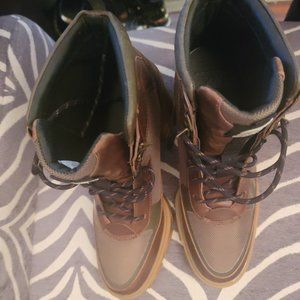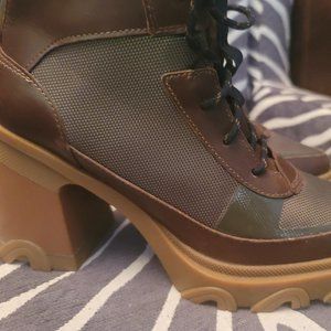 Elevate your style with these Sorel Women's Brex Heel Lace Booties. These shoes feature a round toe and lace-up closure for a secure fit. The ankle-height shoe shaft style makes it perfect for any occasion, whether it's casual or business wear. The colorblock pattern in green and brown adds a touch of uniqueness to the booties. The 4-inch block heel provides the perfect amount of height for comfort and style. The upper material is made of leather and textile, while the lining material is synthetic. The outsole material is rubber, ensuring durability and traction. These booties are perfect for any season, whether it's winter, summer, fall, or spring.