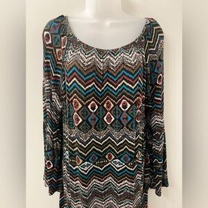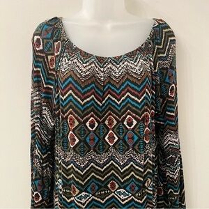 Adorable Women’s Retro Boho style Dress. Incredibly soft material that can stretch. Meant to be loose fitting. Purchased from a local Boutique in the Area. Dress has multiple colors. Cream, teal blue, green, burgundy, black Aztec abstract print. Chevron print with diamonds. Dress has long bell style sleeves. Boat neckline with elastic. Can also be worn off the shoulder style