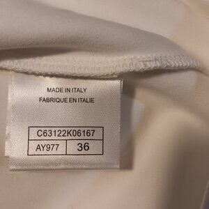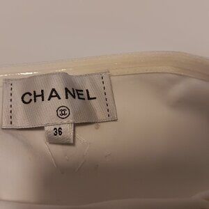 A white Chanel camisole top adorned with various gold-colored embellishments, including the Chanel logo, stars, and scissors. My daughter wore this once for an event, size 36. Please review the photo, you can ask questions . Thank you for looking.