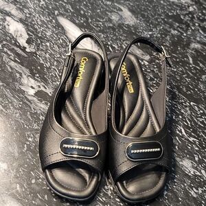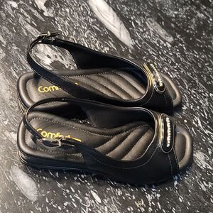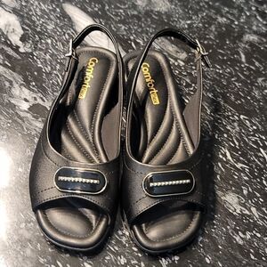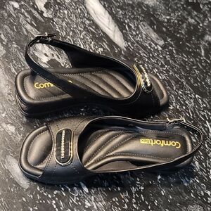WOMEN'S COMFORT FLEX SLINGBACK SANDAL SIZE 4 COLOR BLACK Peep toe comfortable sandals with slingback buckle strap. Low platform sole.Fit kinoniko Lining Composition textile Outer Composition Synthetic leather Bottom Composition Synthetic leather Heel Height measurements approximately 1"1/2 inched THIS ITEMS IS PRE-OWNED EXCELLENT CONDITION WITH ONLY LIGHT SIGNS OF WEAR IF ANY CHECK THE PICTURES
