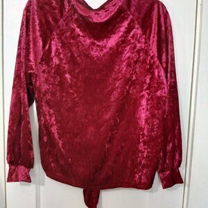 cotton bleu brand, crimson velour top, long sleeve with cuff, waist length in front, hangs slightly longer in back, knotted front waist. this will look so good with black leather pants, or with casual jeans, perfect for the holidays