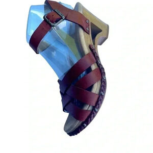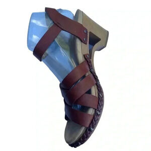 PREOWNED GREAT CONDITION WOMEN’S DANSKO TRU SANDALS•SIZE 39/US 8.5-9•MEDIUM BROWN•GENUINE LEATHER•WOODEN TYPE HEELS AND BRAIDED LEATHER/STUDDED DESIGN AROUND FRONT AND SIDES OF SHOES•