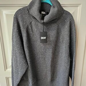 BEAUTIFUL WOMENS GREY DKNY COWL NECK SWEATER WITH SILVER FLAT STUDDING ON THE SLEEVES. NWT. SIZE XL & FROM A NON-SMOKING NO PETS HOME.