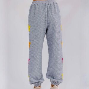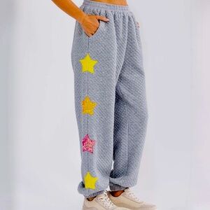 New With tags 100% Polyester Contrast: 97.8% Cotton 2.2% Spandex. Medium Length: 39” Waist: left to right 15.5” or 31” Inseam: 28". Elastic waist for comfort, sequin star details for a touch of glamour, front pockets, relaxed fit perfect for layering, high-quality polyester blend for durability