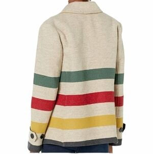 A women's wool jacquard coat featuring the bold, brilliant stripes of the iconic Glacier Park pattern, perfectly matched across the double-breasted design. Woven in Pacific Northwest mills from pure virgin wool, with a classic fit and flapped, side-entry pockets.