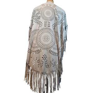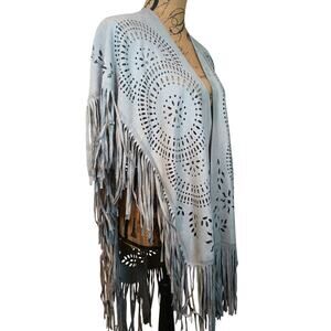 Beautiful festive gray cut out laser cut floral spiral wrap lined with fringe tassels. Suedette suede and soft. Pictures do not do it justice. Asymmetrical, 100% Polyester. Do Everything In Love Brand. Approx. 27" across & 32" long plus fringe/tassel.