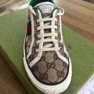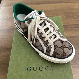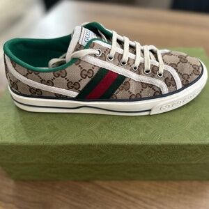 Pre-owned but in really good condition. Detail: Beige/ebony color Original GG canvas White contrast details Green and red Web Green grosgrain trim Gucci Tennis 1977 label GG motif at the sole Made in Italy Style 606110 MSRP $790 Comes with original shoe box