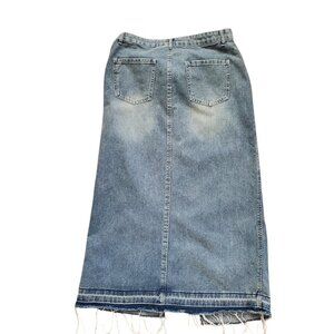 Happily Grey maxi denim skirt with a high front split and raw hem. Size 9. Material has no stretch. Two back pockets and two front pockets. Button/zip fly. S54-S1