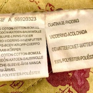 Jacket details two front zip pockets, two button flap pockets, shoulder epaulettes and chevron detail on button sleeves. 100% cotton "canvas" feel exterior with quilted floral print lining for extra warmth. Extra buttons and rivets included. Like new without holes or stains.